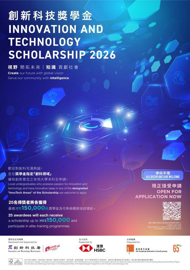Supported by the Innovation and Technology Commission and the Hongkong and Shanghai Banking Corporation Limited (HSBC), and organized by the Hong Kong Federation of Youth Groups (HKFYG), the Innovation and Technology Scholarship (創新科技獎學金) aims to nurture more young talents to pursue I&T as their lifelong career.
