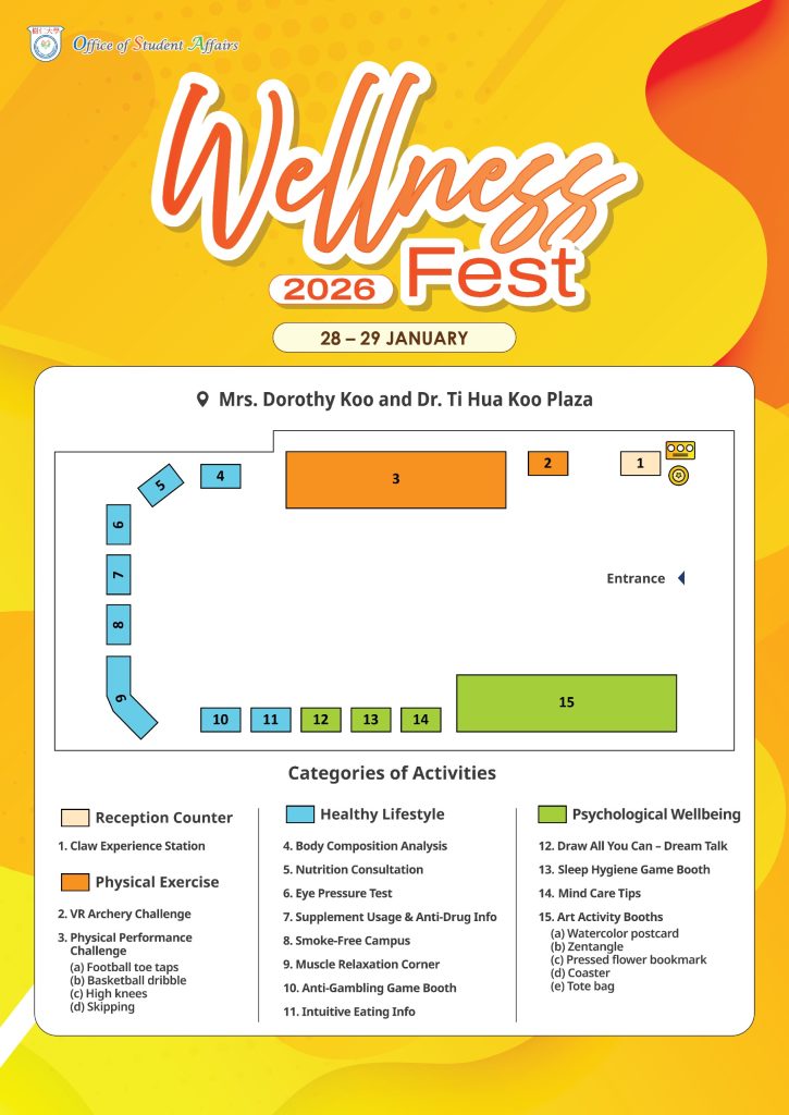 You are cordially invited to join our “Wellness Fest 2026” organised by Office of Student Affairs on 28 and 29 January. An event dedicated to promoting holistic wellness together. All students and staff are welcome.