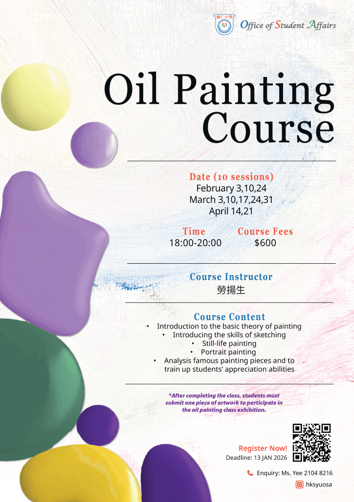 油畫初班 Elementary Oil Painting Course 油畫初班 Elementary Oil Painting Course日期:2月3, 10, 24日3月3, 10, 17, 24, 31日4月14, 21日時間:18:00-20:00地點:宿舍文康大樓1/F, H101導師:勞揚生先生費用:$600 按此了解付款及報名詳情。截止報名日期: 2026年1月13日查詢: osa_activities@hksyu.edu Post published:January 5, 2026 Post category:News Read more articles Previous Post日語基礎班 Japanese Language Course (Fundamental level) Next Post幸福手作研習所 Wellness Art Academy You Might Also Like Financial Talk: Deposit Protection Scheme September 29, 2025 李國賢及李志雄聾人教育基金 2023/24 July 27, 2023 Self-financing Post-secondary Scholarship Scheme (SPSS) 2023/24 October 24, 2023
