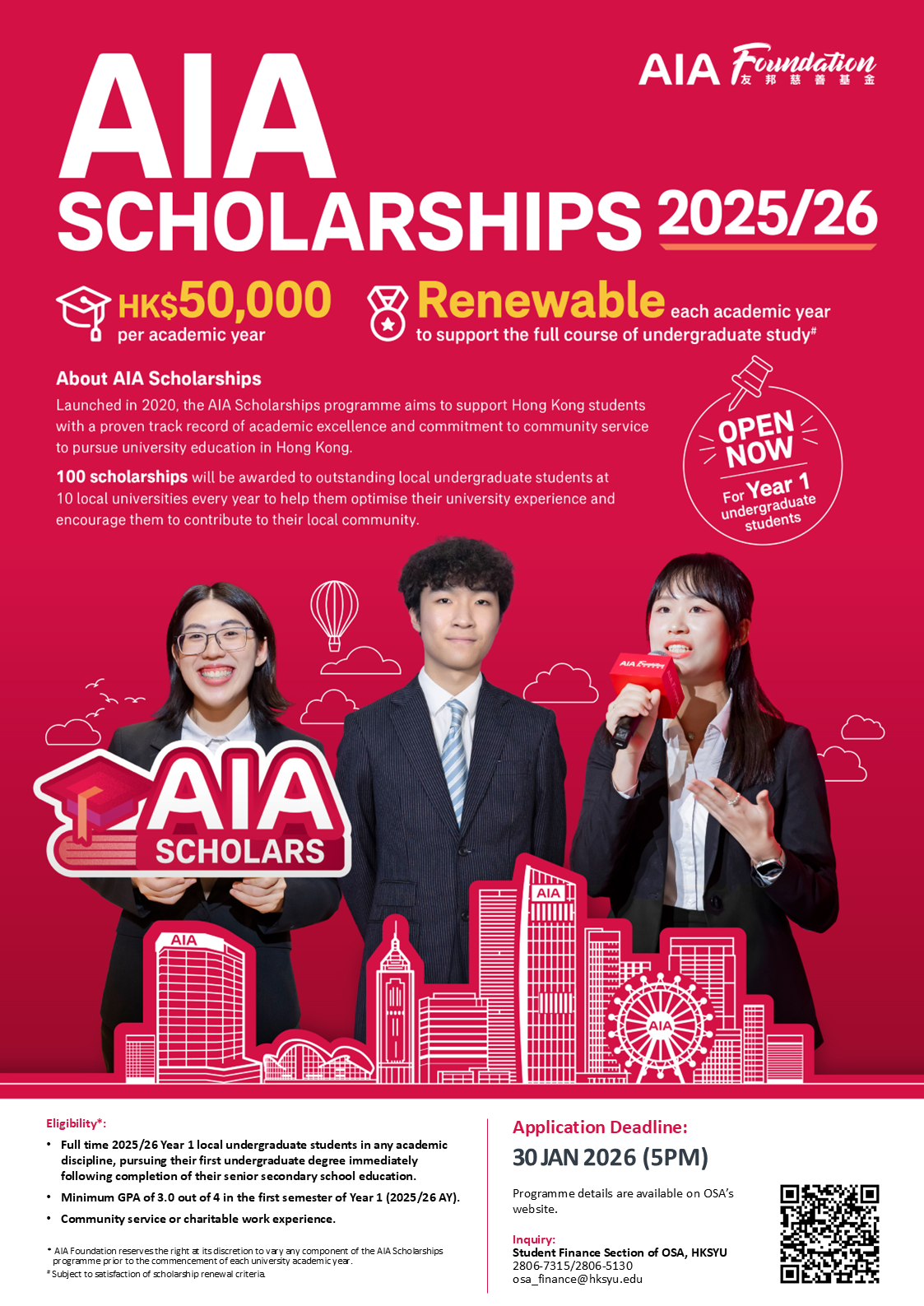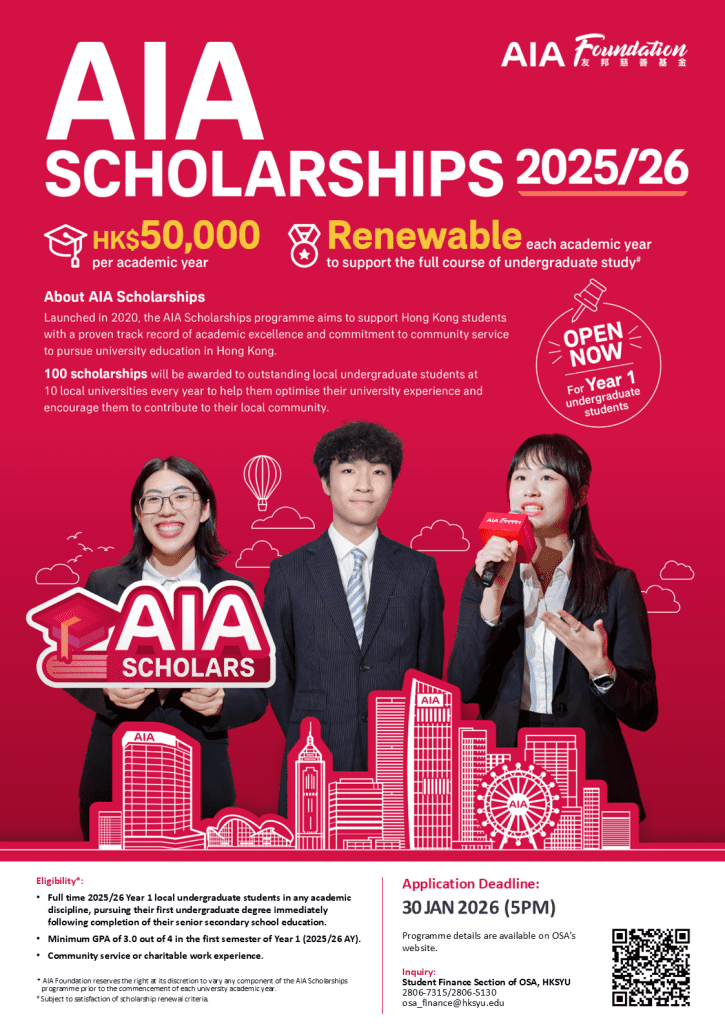 AIA Scholarships 2025/26 Application Guidelines Application Form Apply Now Post published:January 13, 2026 Post category:Moodle / Student Finance Read more articles Previous Post2025-2026 Fitness Room Using Workshop (2nd Semester) Next PostHSBC Scholarship Scheme 2025/26 You Might Also Like Dr. Li Dak Sum Outstanding Whole Person Development Awards 2024/25 August 14, 2024 HSBC Scholarship Schemes 2023/24 November 20, 2023 領展大學生獎學金 – 大學二至四年級獎學金 April 15, 2024