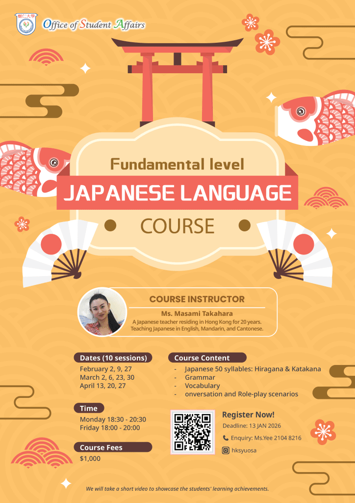 2) Paid in Person: Visit OSA (Rm 402, 4/F, Residential & Amenities Complex) in person and pay the course fees by cash or Octopus card between 05-13/01/2026