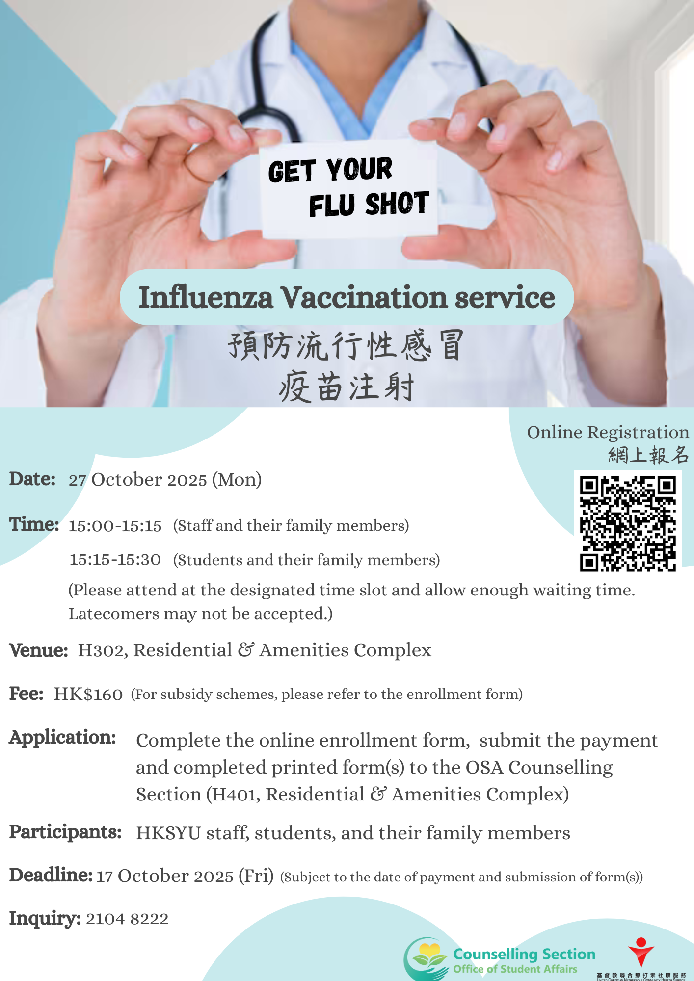 Voluntary Healthcare Plans & Services 2025-26 Outpatient Medical Service – for HKSYU students and staff(Quality Healthcare卓健 / Human Health 盈健) Dental Service & Application Form for HKSYU students and staff, please login to access:(Health & Care Dental 恆健牙科 / Human Health – PolyDental 盈健- 健滙牙科) for HKSYU alumni, please submit the Online Request Form HPV Vaccination – for HKSYU students(Poster 2025-26 / Vaccine information Q&A) Body Check Packages & Others(卓健 Quality Healthcare) Outreach Influenza Vaccination Poster 2025-26 Enquiry: 2104-8222 (OSA Counselling Section)